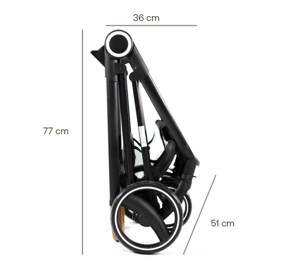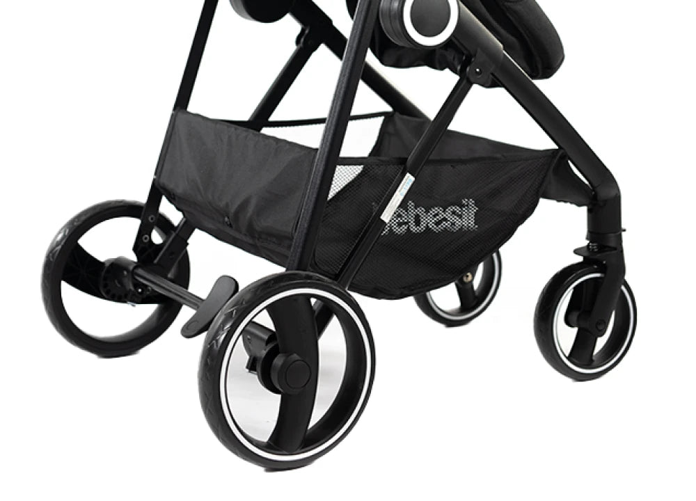 El coche tiene freno centralizado en ruedas traseras, que se activa con un solo movimiento. Las ruedas delanteras, con suspensión y giro 360º, cuentan con traba para fijarlas.