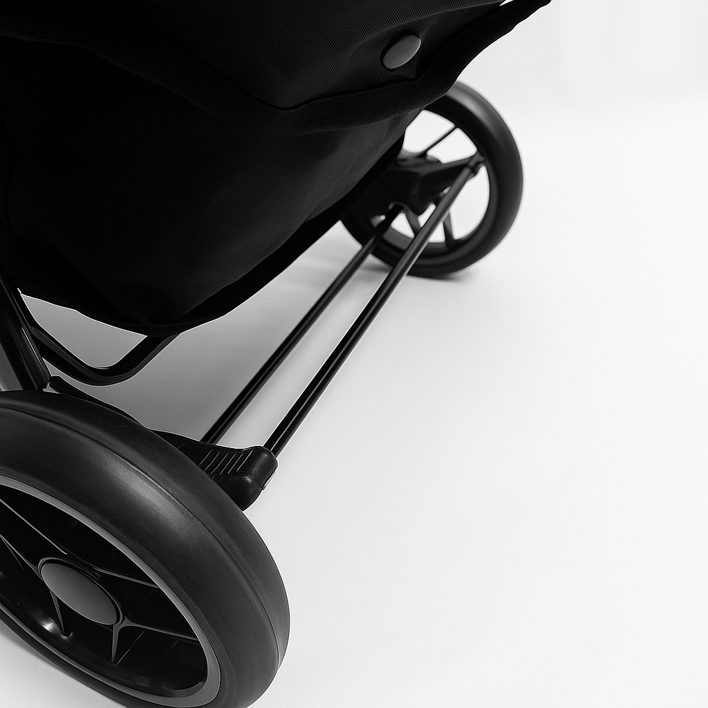 Ruedas delanteras giratorias 360º con traba de seguridad y suspensión para paseos suaves.