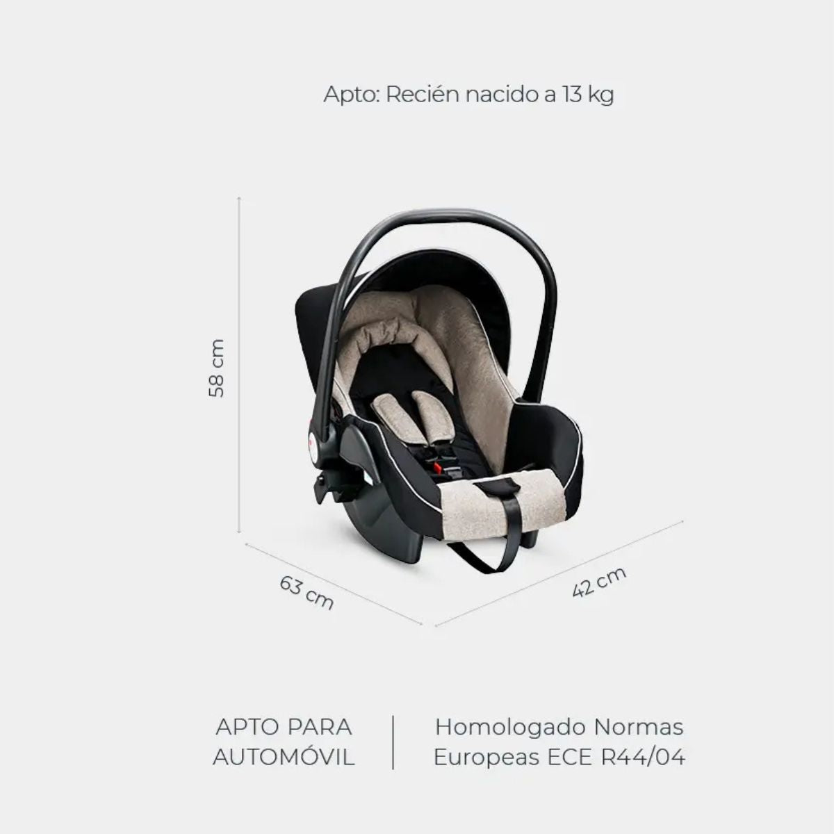 El coche CITY TRAVEL incluye una silla de auto huevito homologada bajo normas europeas ECE R44/04, garantizando máxima seguridad desde el nacimiento hasta 13 kg.