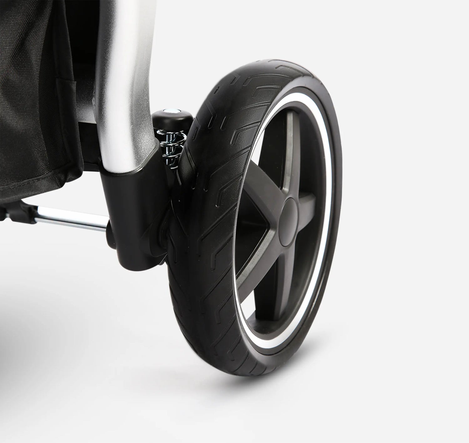 Las ruedas de gran diámetro con amortiguación ofrecen seguridad y estabilidad en todo tipo de superficies. Las ruedas traseras tienen freno y suspensión, mientras que las delanteras giran 360° y pueden fijarse sobre el eje, facilitando el desplazamiento en terrenos irregulares.