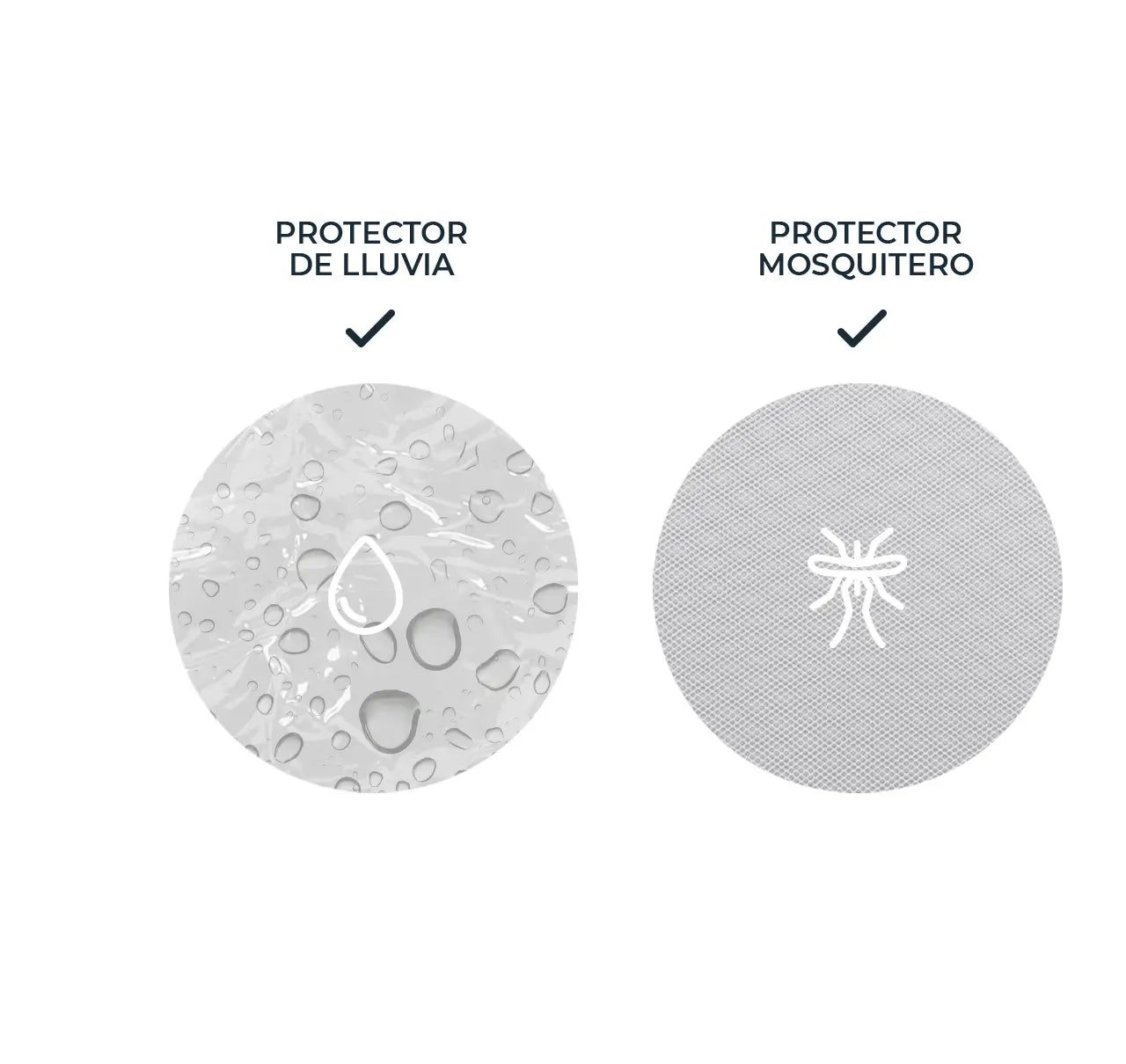 Incluye un cobertor de lluvia con costuras impermeables reforzadas, ideal para proteger al bebé del viento en días inestables. Además, cuenta con una red mosquitera que se adapta fácilmente al cochecito.