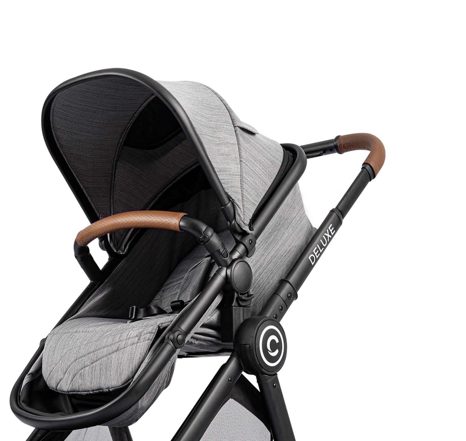 El cochecito DELUXE V2 tiene un asiento que se convierte en moisés en solo 3 pasos. Incluye un cubrepiés desmontable que protege al bebé del frío. Además, trae una butaca huevito homologada bajo normas europeas ECE R44/04, que se adapta fácilmente al cochecito mediante un sistema de encastre.