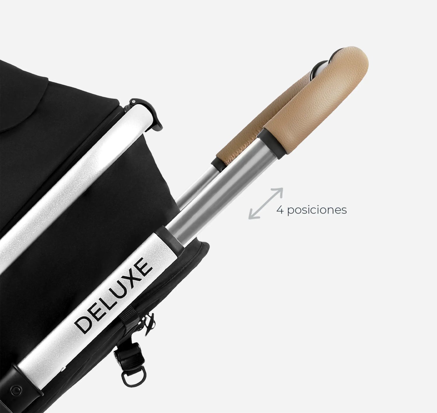 El manillar del cochecito es ajustable en altura con 4 posiciones disponibles para mayor comodidad. Está recubierto en ecocuero microperforado, ofreciendo una sensación agradable al tacto. La altura máxima desde el suelo es de 105 cm.