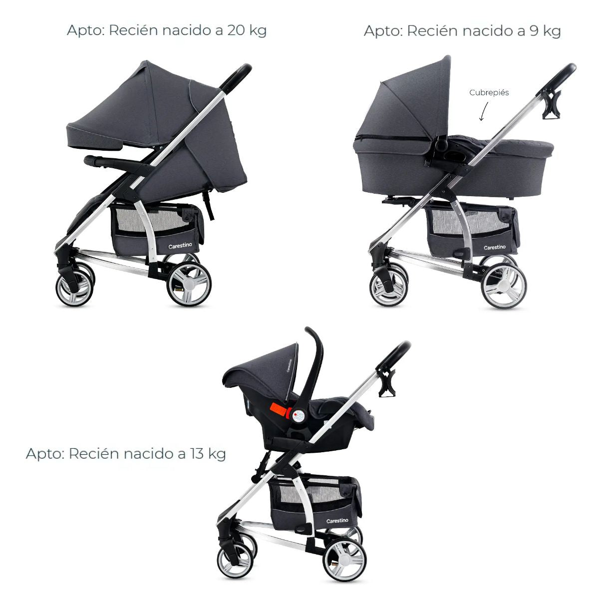 El apoyapiés ajustable y el respaldo con múltiples posiciones, incluido reclinado total, lo hacen apto para recién nacidos.