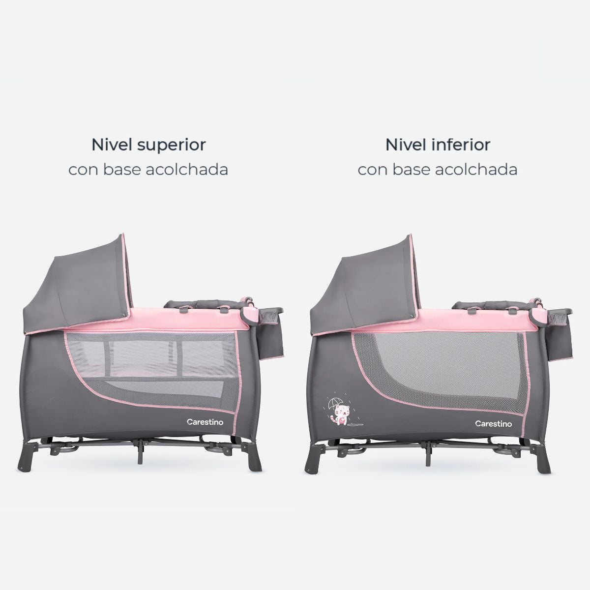 Adaptá la practicuna a tu bebé con dos niveles de uso: como corralito en el primer nivel y como cuna en el superior, con base ajustable y cierre seguro.