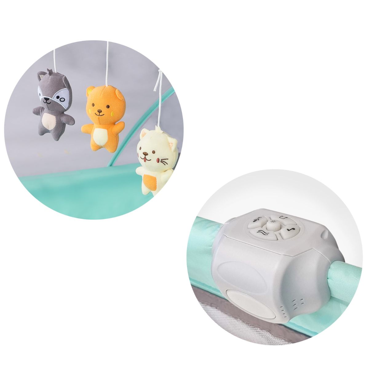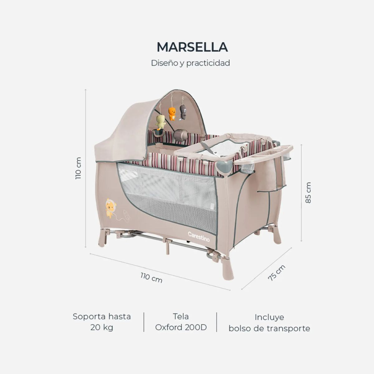 La practicuna MARSELLA incluye una capota desmontable con 3 peluches móviles, perfecta para entretener al bebé.