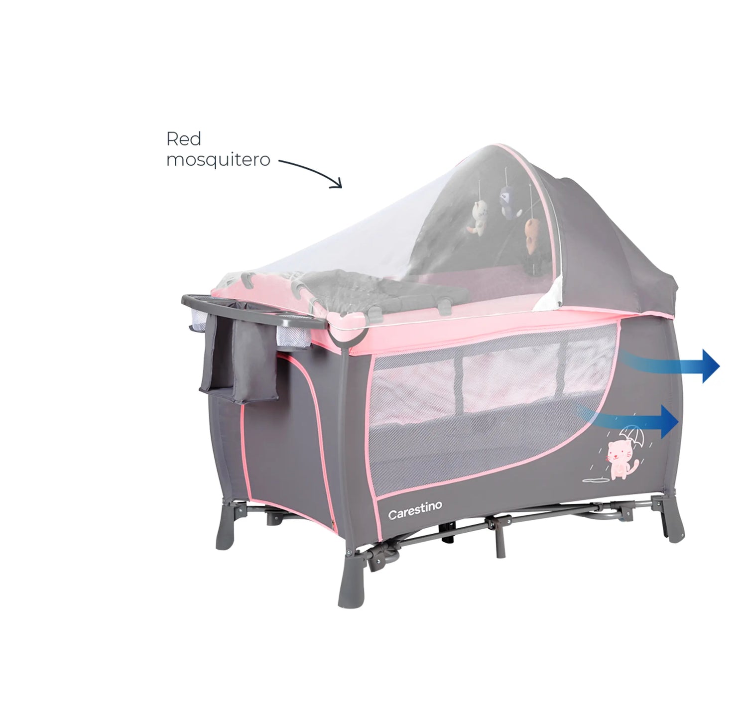 Diseñada pensando en los padres, la practicuna incluye un bolsillo lateral amplio y funcional para guardar accesorios esenciales. En el lado opuesto, tiene una entrada con cierre para juguetes, manteniendo todo organizado y al alcance.