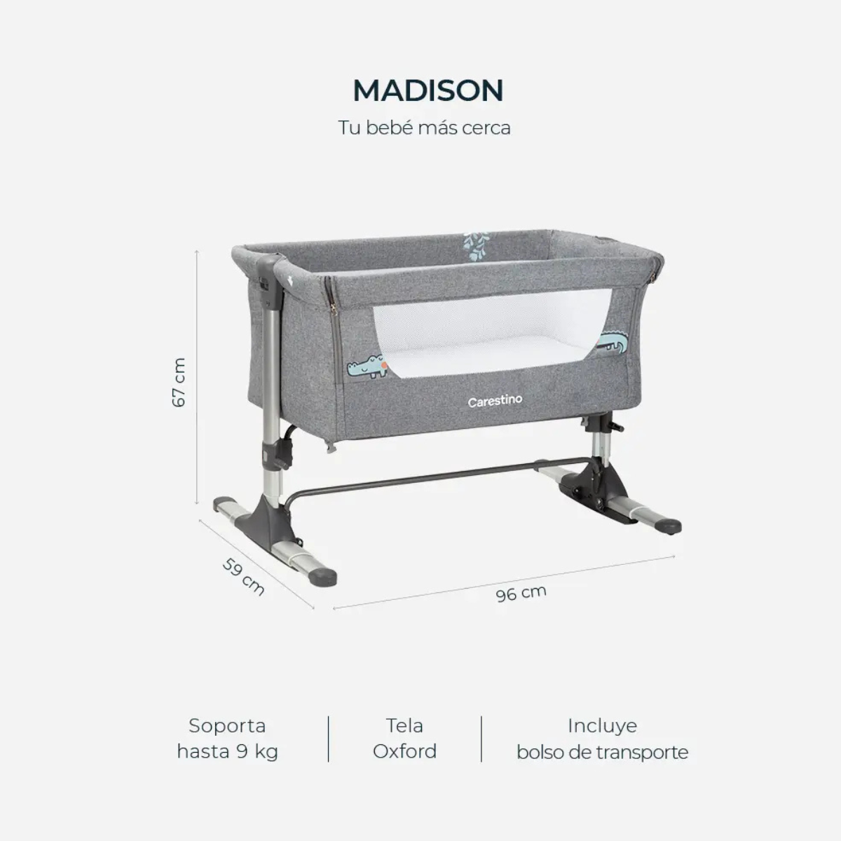La cuna colecho MADISON es completamente desmontable, lo que facilita un guardado práctico y portátil. Incluye un bolso de transporte, ideal para familias que buscan comodidad y versatilidad al llevar la cuna a cualquier lugar.