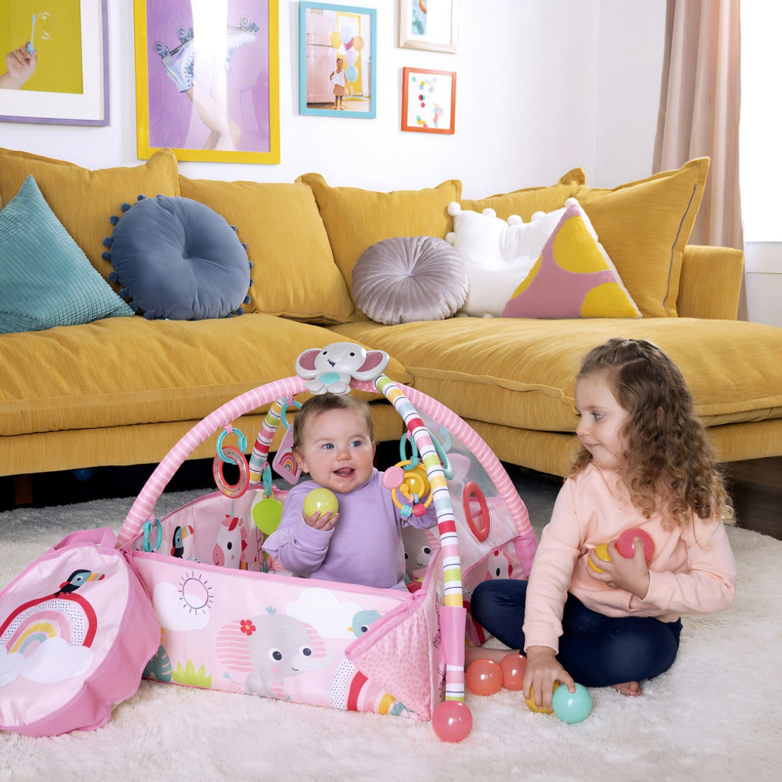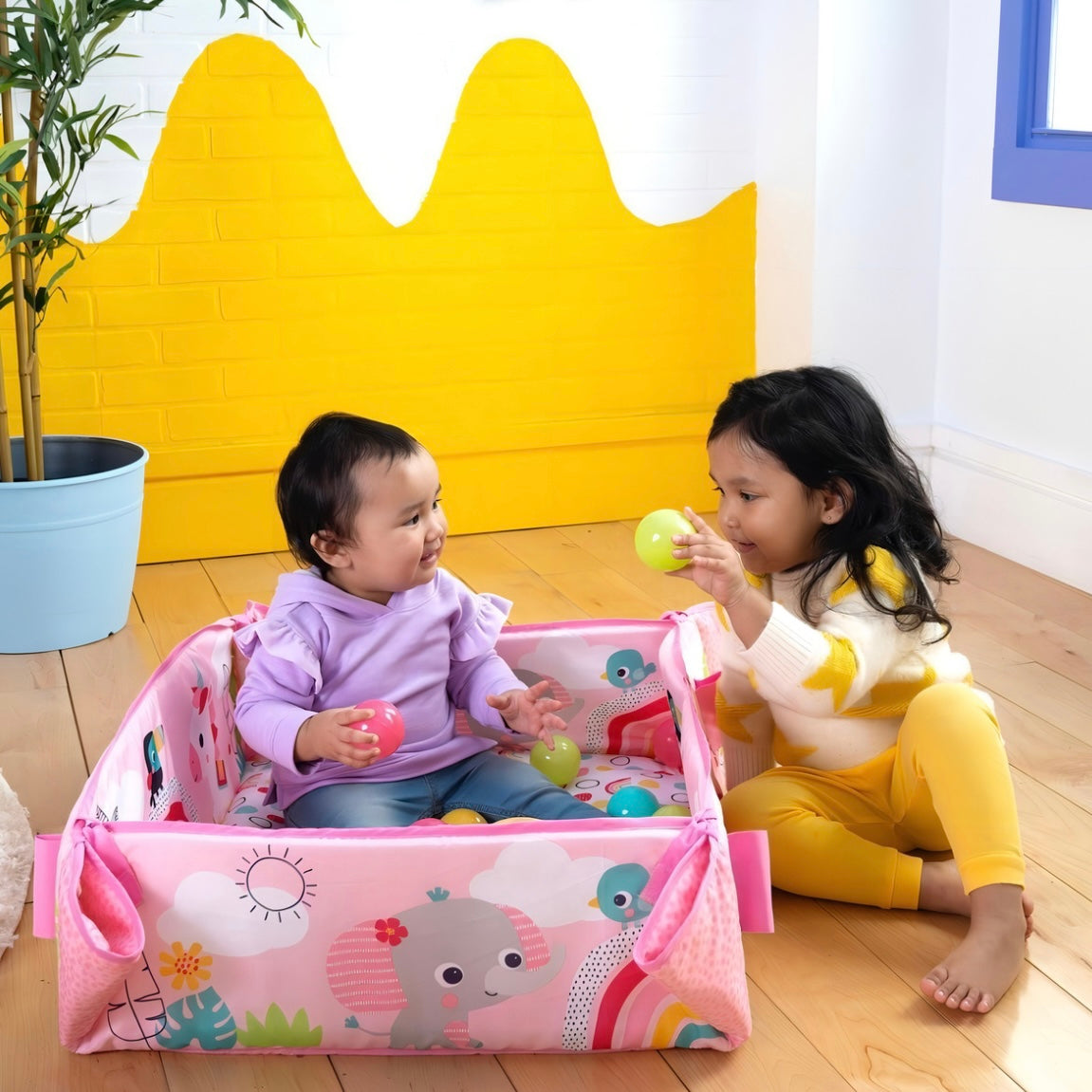 • Los padres pueden dejar caer bolas a través del agujero del toldo de malla, o el bebé puede practicar habilidades motoras rodando o pasando las bolas hacia adelante y hacia atrás