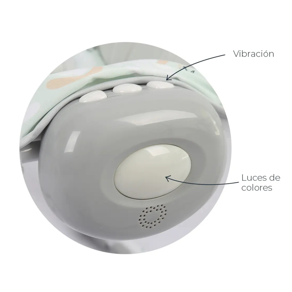 Incluye un dispositivo electrónico avanzado con 8 melodías relajantes, luces de colores y vibración suave, creando una experiencia sensorial única para el bebé.