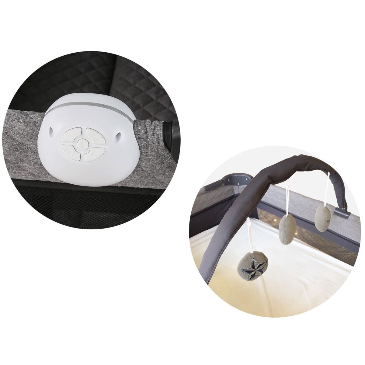 La practicuna GENOVA incluye accesorios tecnológicos para un mejor descanso y entretenimiento. Viene con un dispositivo musical con melodías, luces y vibración, además de reconocimiento de voz y llanto que se activa automáticamente para calmar al bebé.