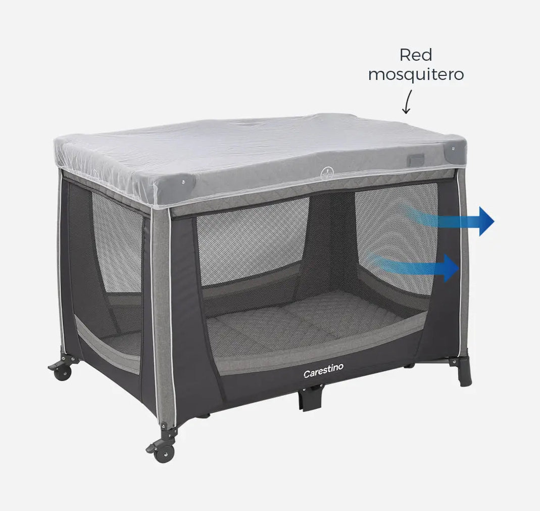 La practicuna GENOVA cuenta con red mosquitero desmontable que cubre toda la superficie, protegiendo al bebé de insectos y agentes externos. Sus tejidos laterales respirables aseguran una ventilación continua y un ambiente fresco y seguro.