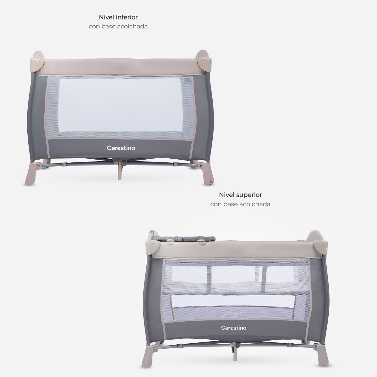 La practicuna VIENA se adapta a las necesidades de tu bebé con su sistema de doble nivel: úsala como corralito en el primer nivel y como cuna en el nivel superior agregando la base.