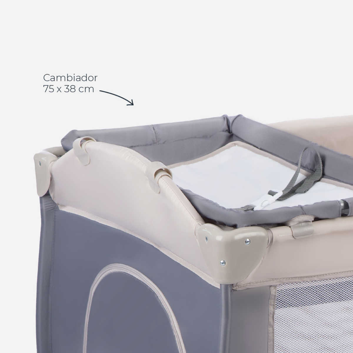 La practicuna VIENA tiene compartimentos amplios para guardar lo que tu bebé necesite: un bolsillo grande para lo esencial y una entrada con cierre para mantener juguetes organizados y accesibles, facilitando la interacción y el juego.