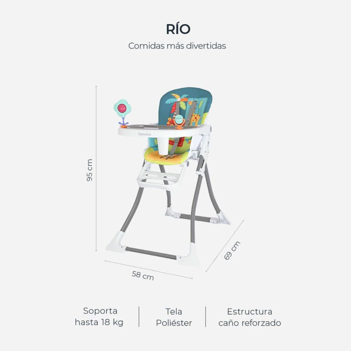 La silla RÍO tiene una estructura de caño reforzado que ofrece alta resistencia y ligereza, perfecta para el uso diario. Su reposapiés regulable y capacidad de soportar hasta 18 kg garantizan ajuste y seguridad duradera a medida que tu bebé crece.