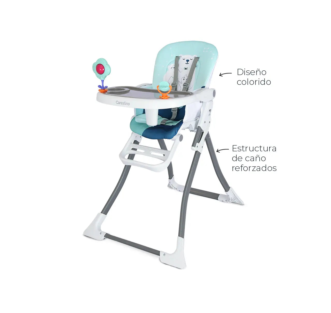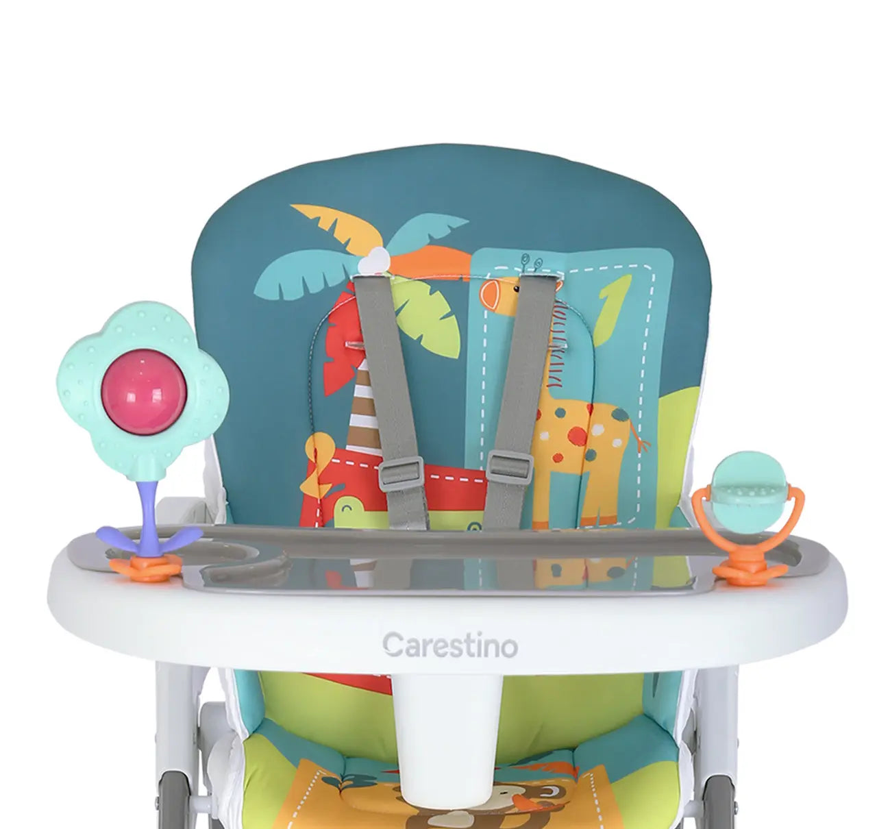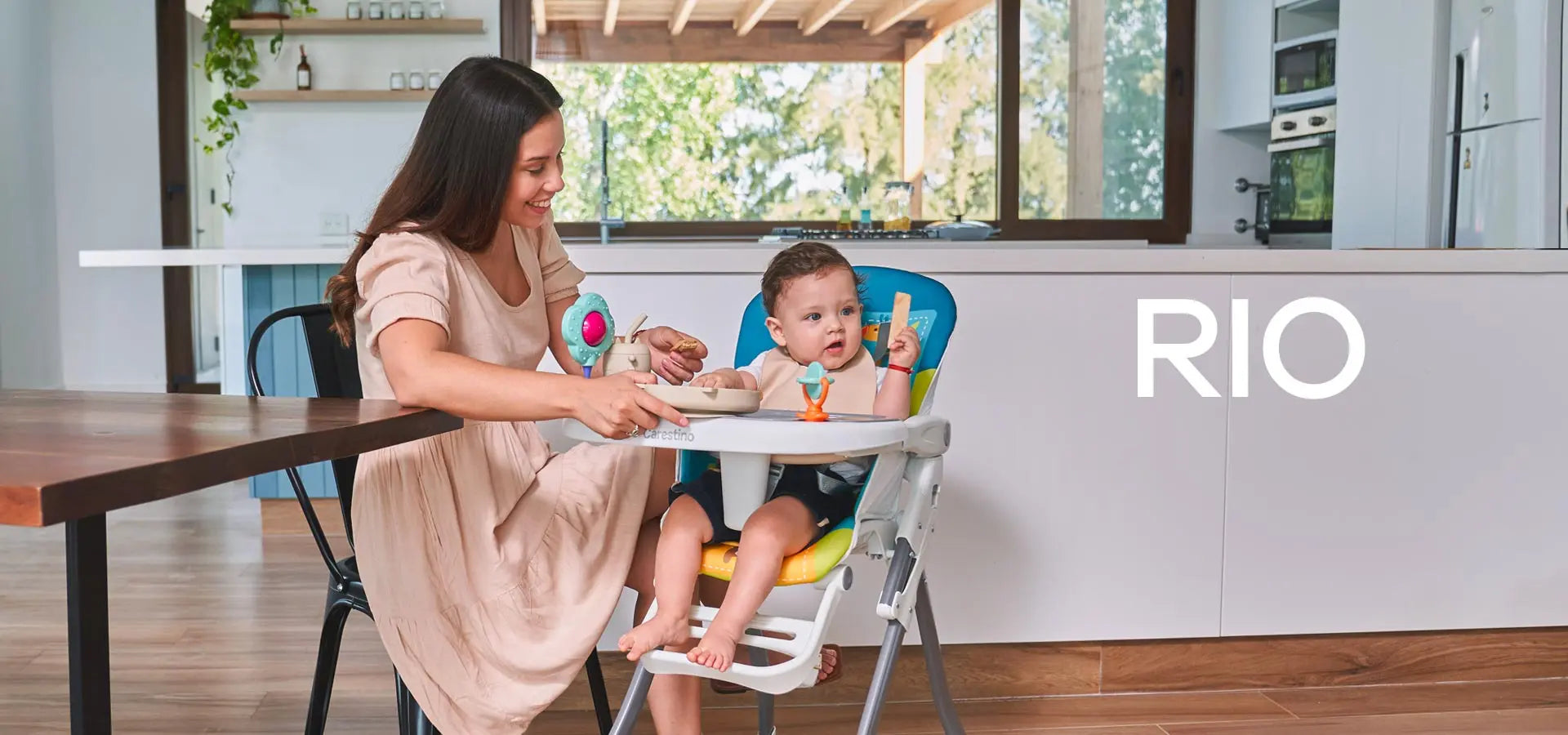 La silla de comer RÍO convierte cada comida en una experiencia única. Sus juguetes de estimulación extraíbles en la bandeja mantienen al bebé entretenido mientras come.